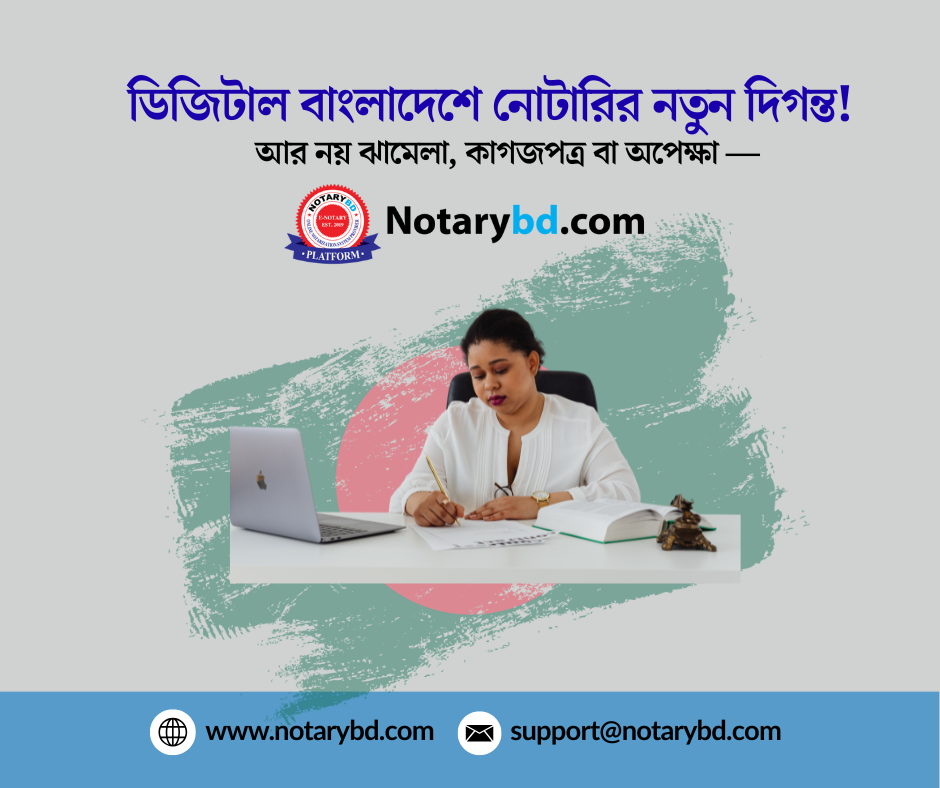 বাংলাদেশ এখন স্মার্ট যুগে পা রেখেছে, আর সেই পরিবর্তনের অগ্রভাগে রয়েছে Notary BD — দেশের প্রথম ও একমাত্র সরকারি অনুমোদিত অনলাইন নোটারি প্ল্যাটফর্ম।